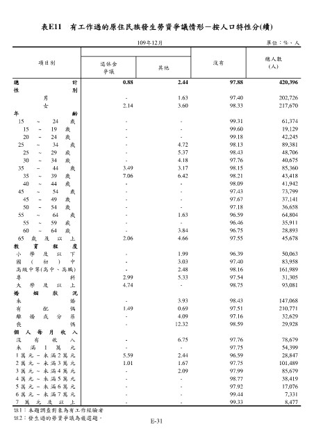 表E11 有工作過的原住民族發生勞資爭議情形-按人口特性分(續)