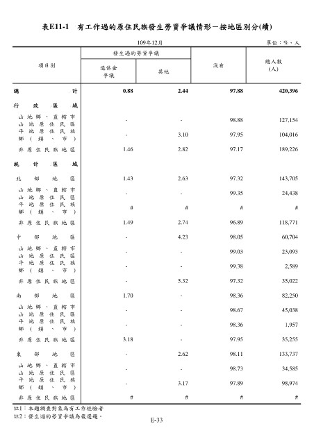 表E11-1 有工作過的原住民族發生勞資爭議情形-按地區別分(續)