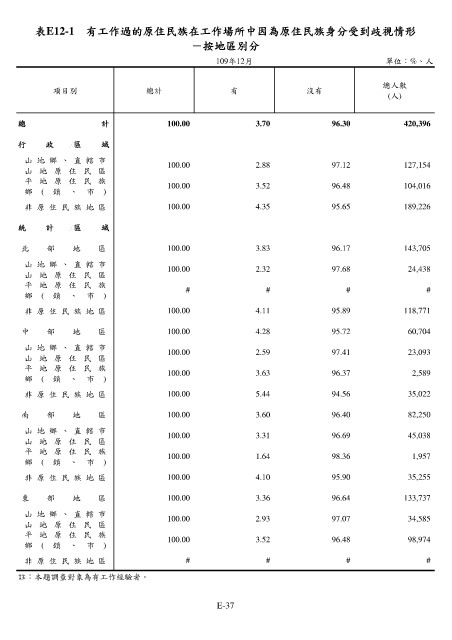 表E12-1 有工作過的原住民族在工作場所中因為原住民族身分受到歧視情形
