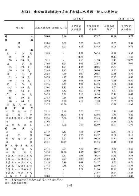 表E14 參加職業訓練後沒有從事相關工作原因-按人口特性分
