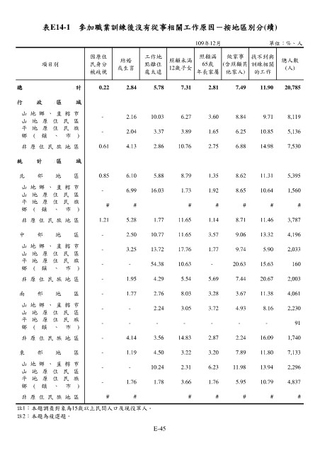 表E14-1 參加職業訓練後沒有從事相關工作原因-按地區別分(續)