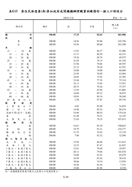 表E15 原住民族想要(再)參加政府或間機構辦理職業訓練情形-按人口特性分