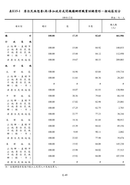 表E15-1 原住民族想要(再)參加政府或間機構辦理職業訓練情形-按地區別分