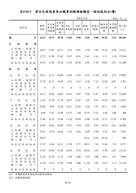 表E16-1 原住民族想要參加職業訓練課程類型-按地區別分(續)