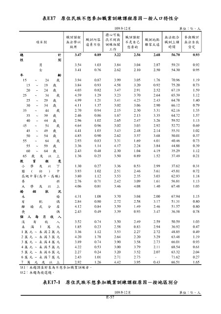 表E17 原住民族不想參加職業訓練課程原因-按人口特性分