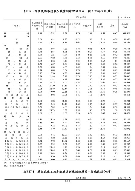 表E17 原住民族不想參加職業訓練課程原因-按人口特性分(續)
