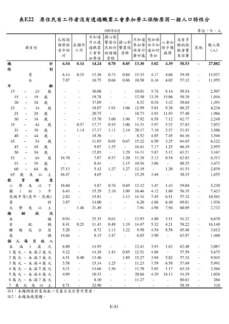 表E22 原住民有工作者沒有透過職業工會參加勞工保險原因-按人口特性分