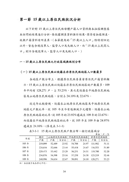 示 , 15 歲以上原住民族以設籍在非原住民族地區的戶數最多,109