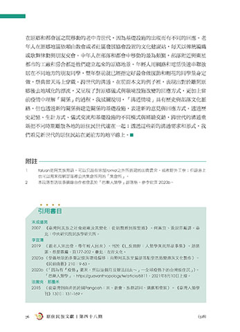 2020b 〈「因為有『疫情』要來,所以這個月沒辦法回去~」―全球疫情下的台灣原住民」〉。