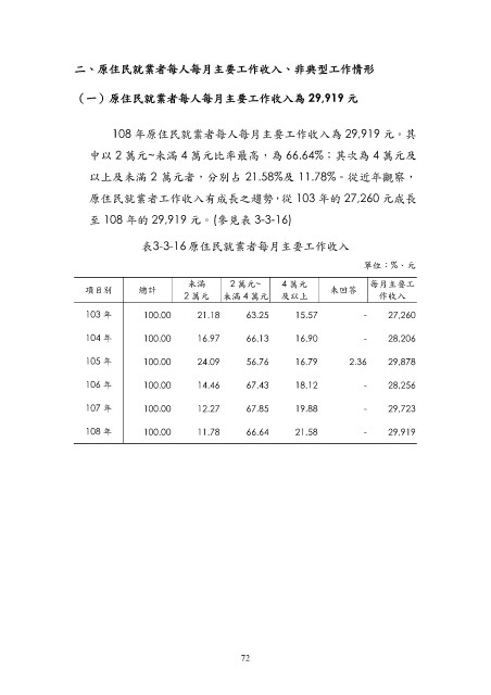 108 年原住民就業者每人每月主要工作收入為 29,919 元。其