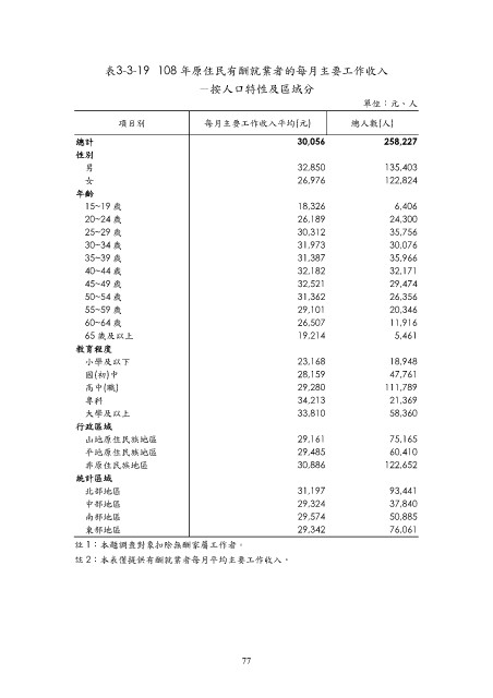 表3-3-19 108 年原住民有酬就業者的每月主要工作收入