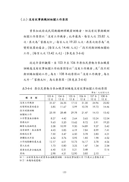 與訓練相關的工作」為主,108 年的原因以「沒有工作機會」為主