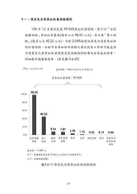 108 年 12 月原住民有 99.96%參加社會保險,其中以「全民