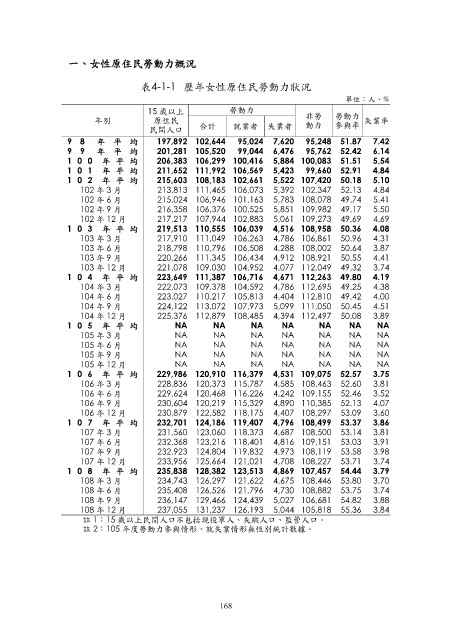 註 2:105 年度勞動力參與情形、就失業情形無性別統計數據。
