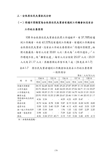 女性原住民失業者,沒有去工作的主要原因以「待遇不符期望」相
