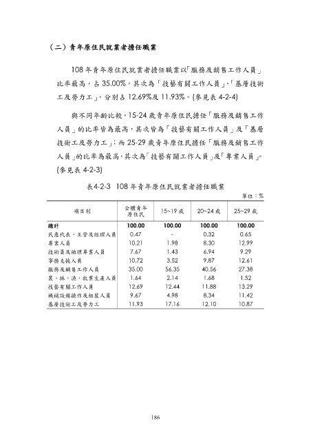 技術工及勞力工」;而 25-29 歲青年原住民擔任「服務及銷售工作