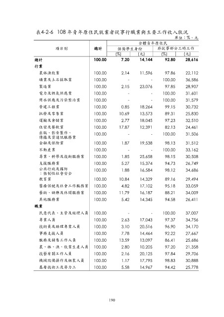 表4-2-6 108 年青年原住民就業者從事行職業與主要工作收入狀況