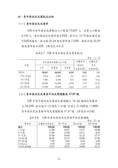 青年原住民失業者平均失業週數為 17.57 週。(參見表 4-2-8)
