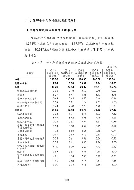 表4-4-2 近五年原鄉原住民族地區就業者從事行業