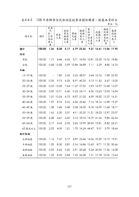 表4-4-5 108 年原鄉原住民族地區就業者擔任職業-按基本資料分