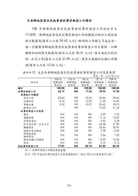 表4-4-10 近五年原鄉地區原住民就業者從事非典型工作及其原因