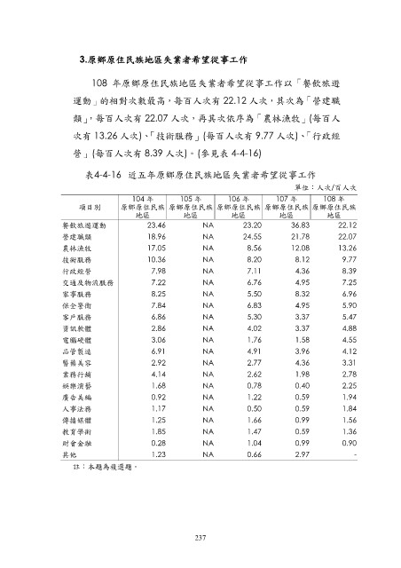 108 年原鄉原住民族地區失業者希望從事工作以「餐飲旅遊
