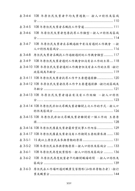 表 3-6-1 108 年原住民再度就業情形-按人口特性及區域分 ........... 136