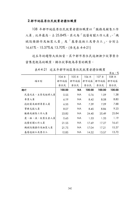 表4-4-21 近五年都市地區原住民就業者擔任職業