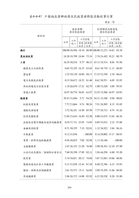 表4-4-41 戶籍地在原鄉的原住民就業者跨區流動從事行業