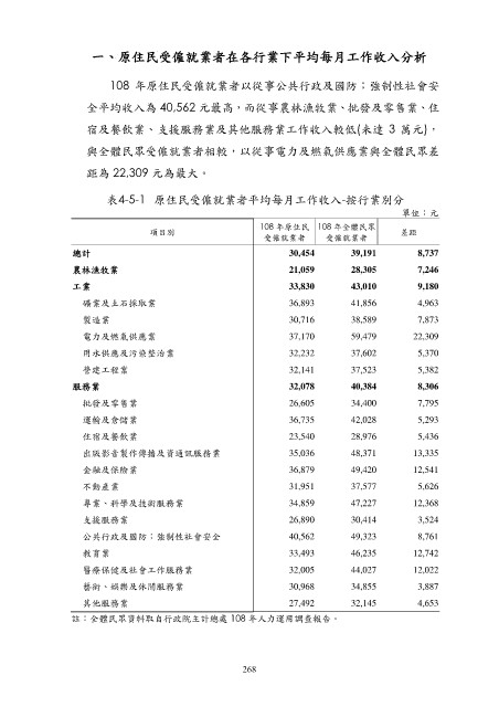 表4-5-1 原住民受僱就業者平均每月工作收入-按行業別分