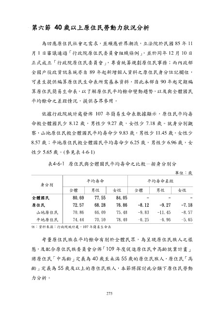 8.57 歲;平地原住民較全體國民平均壽命少 6.25 歲,男性少 6.96 歲,女