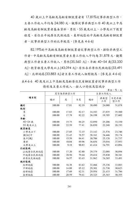元)、北部地區(33,883 元)者主要工作收入相對較高。(參見表 4-6-6)