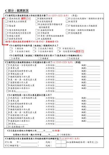 (除答(1)農林漁牧業者續問 C1-1 及 C1-2,其餘跳答 C2)