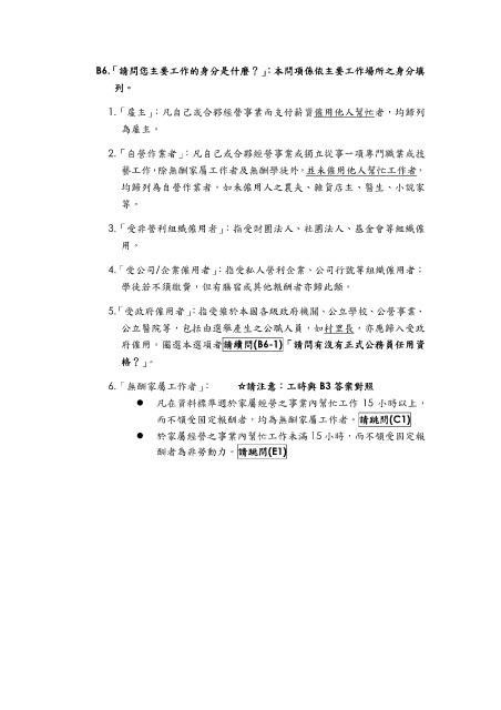 B6.「請問您主要工作的身分是什麼?」:本問項係依主要工作場所之身分填