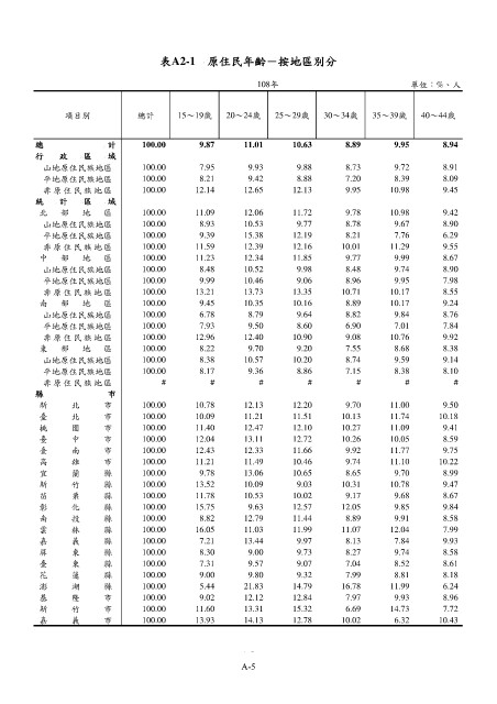 表A2-1 原住民年齡-按地區別分 表A2-1 原住民年齡-按地區別分(續)