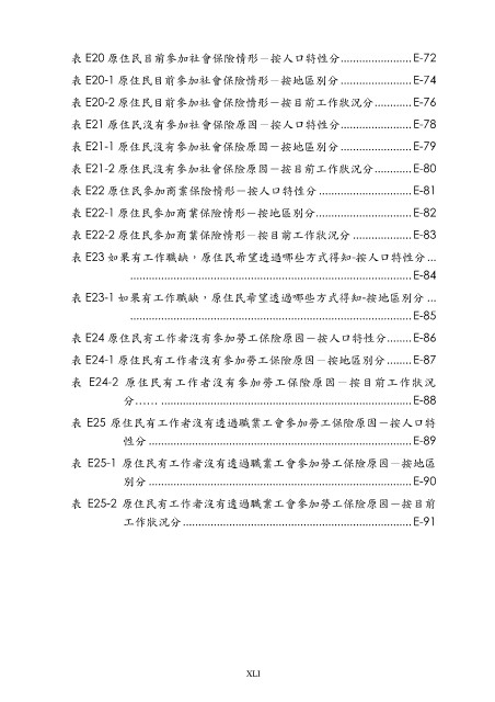 表 E20 原住民目前參加社會保險情形-按人口特性分 ....................... E-72