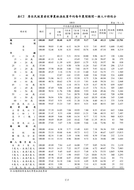 表C2 原住民就業者從事農林漁牧業平均每年農閒期間-按人口特性分