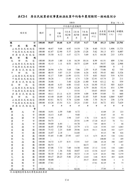 表C2-1 原住民就業者從事農林漁牧業平均每年農閒期間-按地區別分