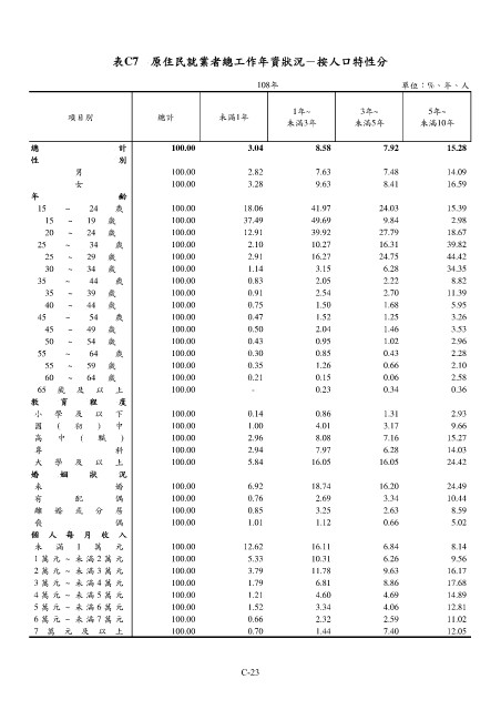 表C7 原住民就業者總工作年資狀況-按人口特性分