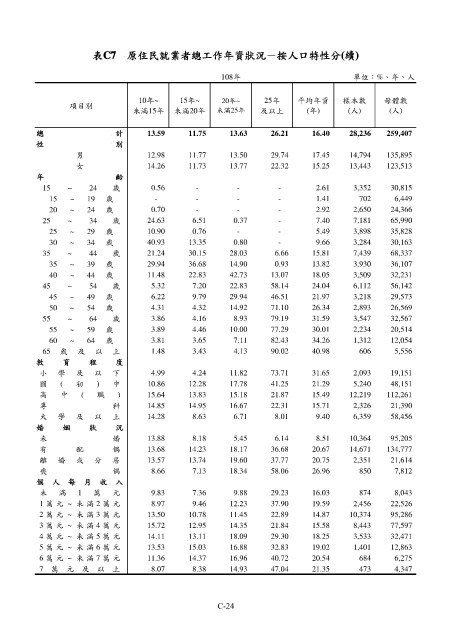 表C7 原住民就業者總工作年資狀況-按人口特性分(續)