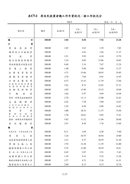 表C7-2 原住民就業者總工作年資狀況-按工作狀況分