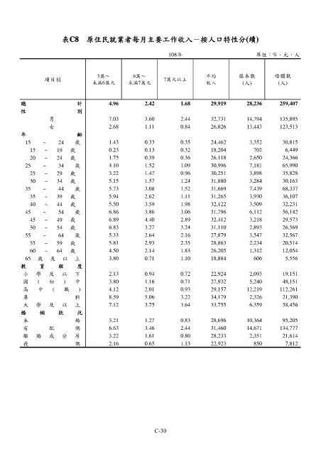 表C8 原住民就業者每月主要工作收入-按人口特性分(續)