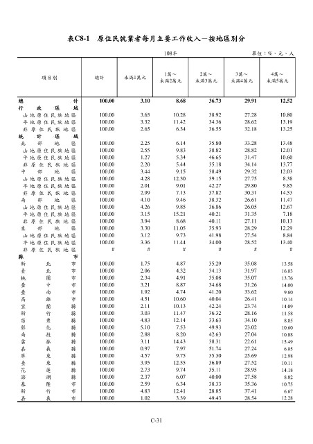 表C8-1 原住民就業者每月主要工作收入-按地區別分