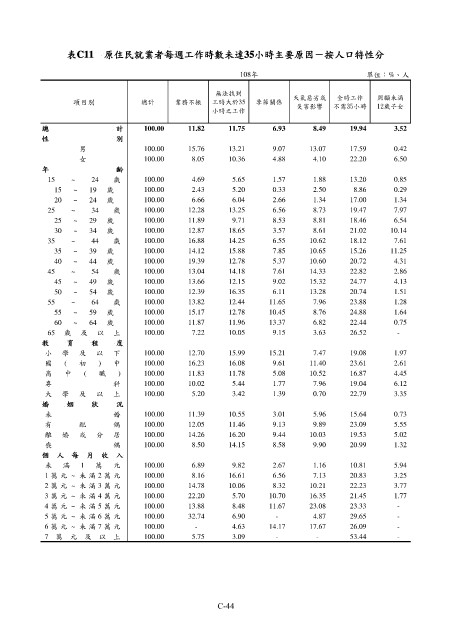 表C11 原住民就業者每週工作時數未達35小時主要原因-按人口特性分