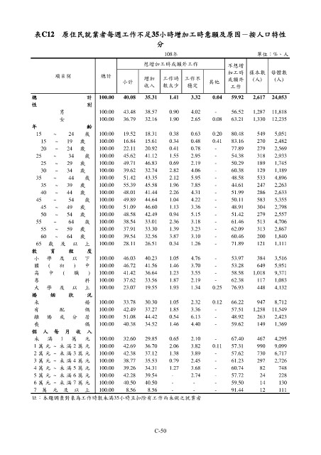 表C12 原住民就業者每週工作不足35小時增加工時意願及原因-按人口特性