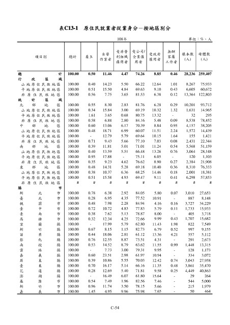 表C13-1 原住民就業者從業身分-按地區別分