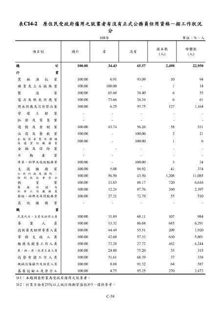 表C14-2 原住民受政府僱用之就業者有沒有正式公務員任用資格-按工作狀況