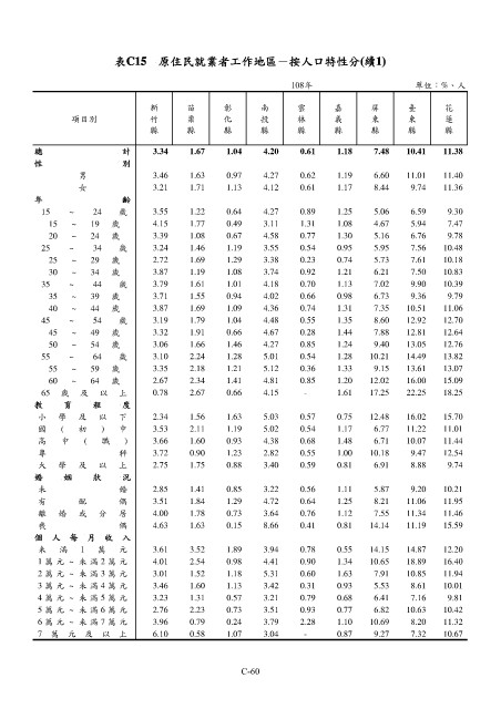 表C15 原住民就業者工作地區-按人口特性分(續1)