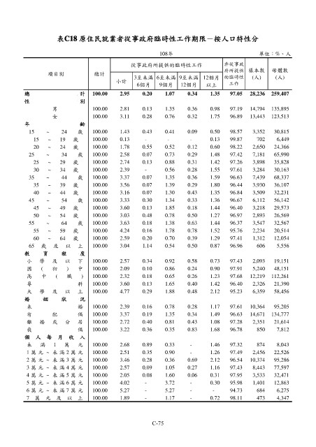 表C18 原住民就業者從事政府臨時性工作期限-按人口特性分