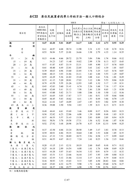 表C22 原住民就業者找尋工作的方法-按人口特性分